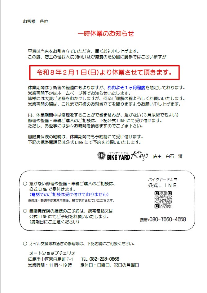 - 50ccスクーターから大型バイクまで幅広く修理・販売を行っております。公式ラインよりご相談下さい。